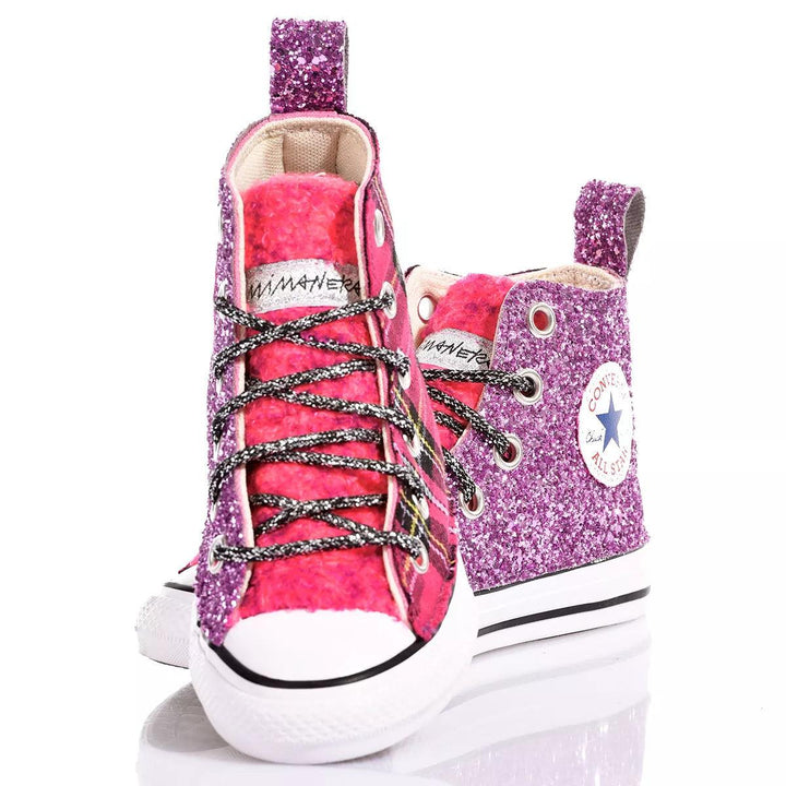 Boki w brokacie i fuksjowa krata z dopasowanym miękkim teddy na języku sprawiają, że te sneakersy to doskonała i zabawna mieszanka. Wygląd uzupełniają czarne i srebrne sznurówki lurexowe.