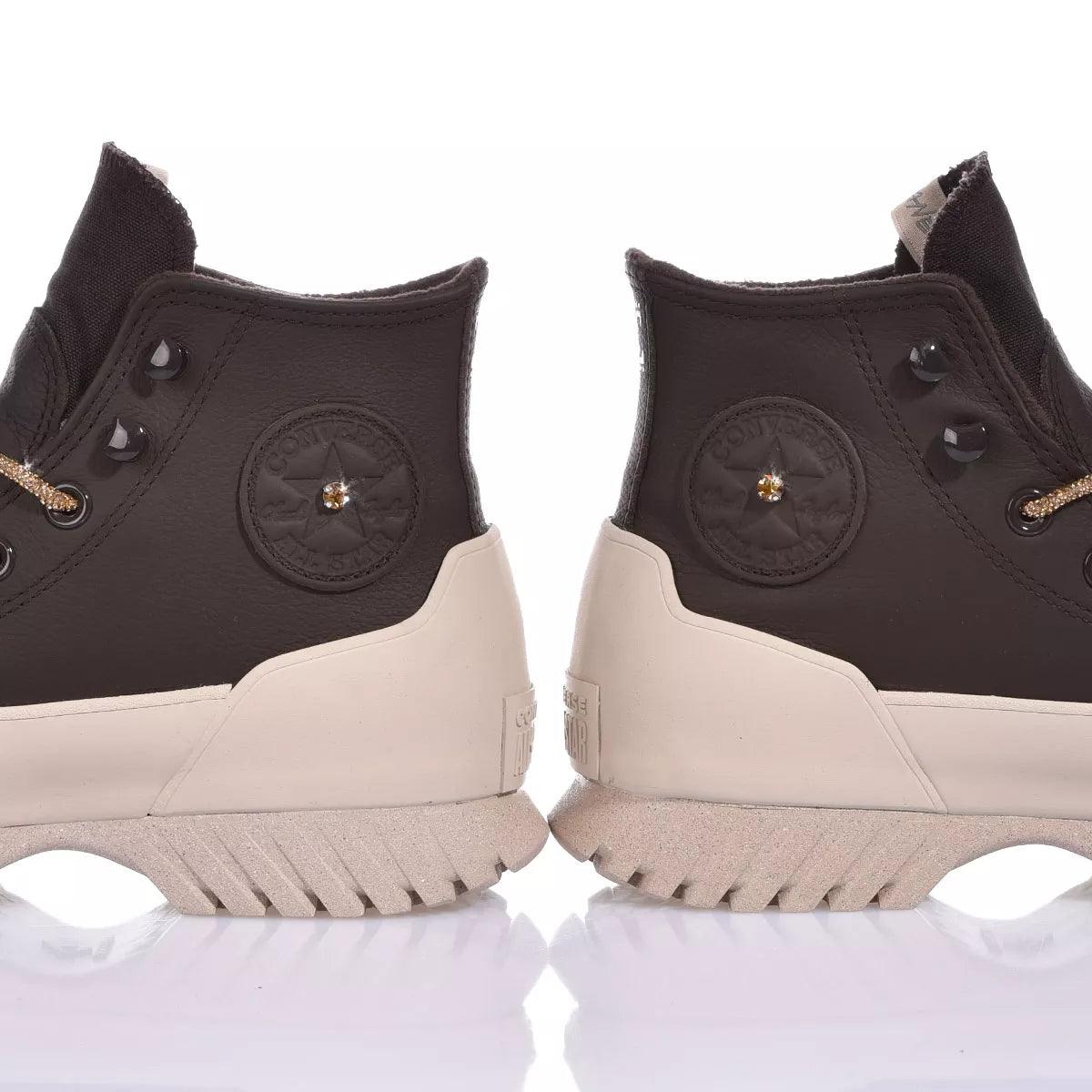 Converse Lugged Gem Brown, the perfect women's personalised sneakers for winter. The glitter on the iconic Converse star, the gold Swarovski laces on the brown faux leather and the fancy beige rubber sole make these trainers a real gem. They go with any look and add a touch of style to your outfit.