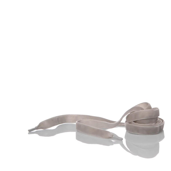 Płaska koronka z jasnoszarego aksamitu. Długość odpowiednia do butów Adidas, Converse, Dr. Martens i butów średniej wysokości.