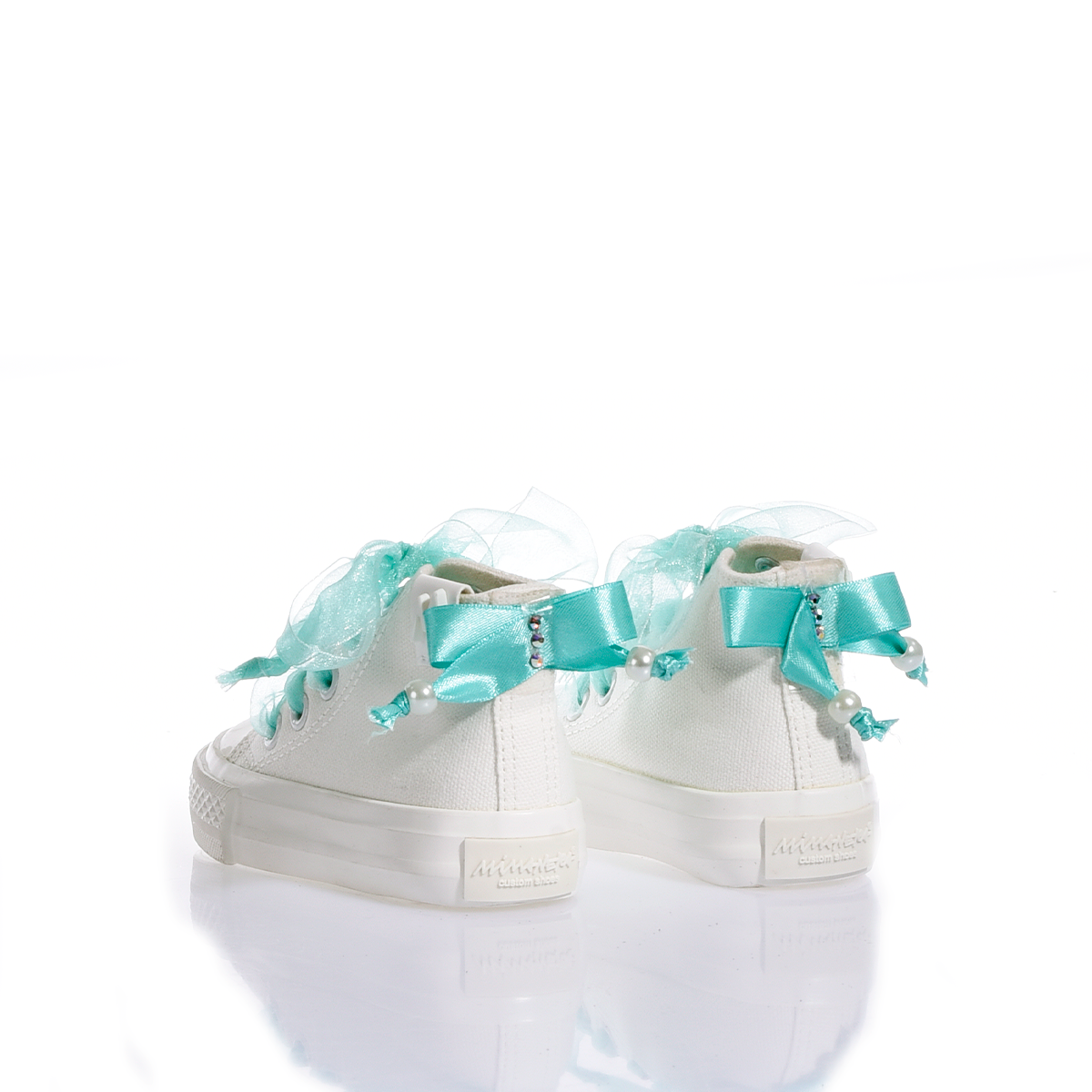 Eleganckie i wszechstronne buty zaprojektowane dla małych księżniczek. Idealnie nadają się zarówno na specjalne okazje, jak i na co dzień. Ekskluzywny detal w postaci tiulowej sznurówki w kolorze Tiffany oraz kokarda ozdobiona trzema kryształkami Swarovskiego w kolorze Tiffany na pięcie dodają im wyjątkowego charakteru.