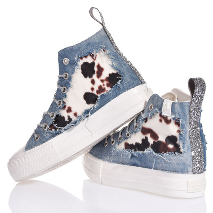Mimanera Airlines Platform Denim Cow to idealne sneakersy dla miejskiego stylu z modowym akcentem. Inspirowane klasycznym modelem Converse, zostały odświeżone dzięki białej podeszwie platformowej, która zapewnia wysokość i komfort. Cholewka z denimu ma duże przetarcie, które odsłania wstawkę z materiału o efekcie sierści w krowie łaty – to wyrazisty i oryginalny kontrast faktur. Brokatowy tył i srebrne sznurowadła z lureksem dodają całości blasku.