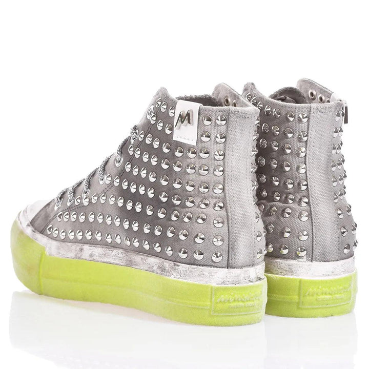 Interamente delavate in grigio e ricoperte di borchie dal gusto rock. La suola floccata in giallo fluo e i lacci argento lurex creano un contrasto vibrante, dando alla sneaker un'energia unica e moderna. Un modello perfetto per chi cerca una sneakers grintosa e originale, senza rinunciare a praticità e tendenze.