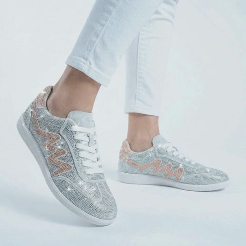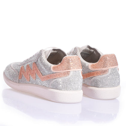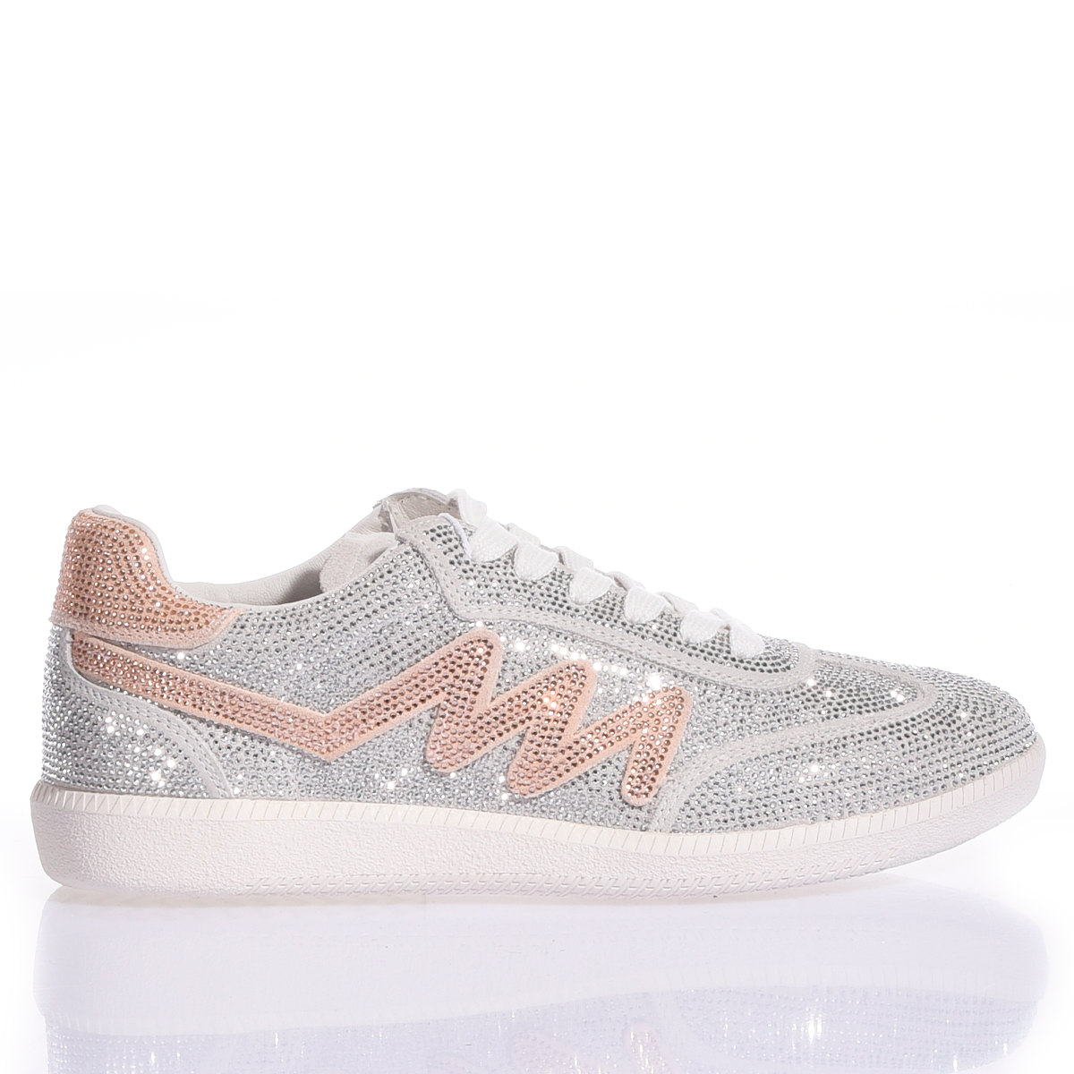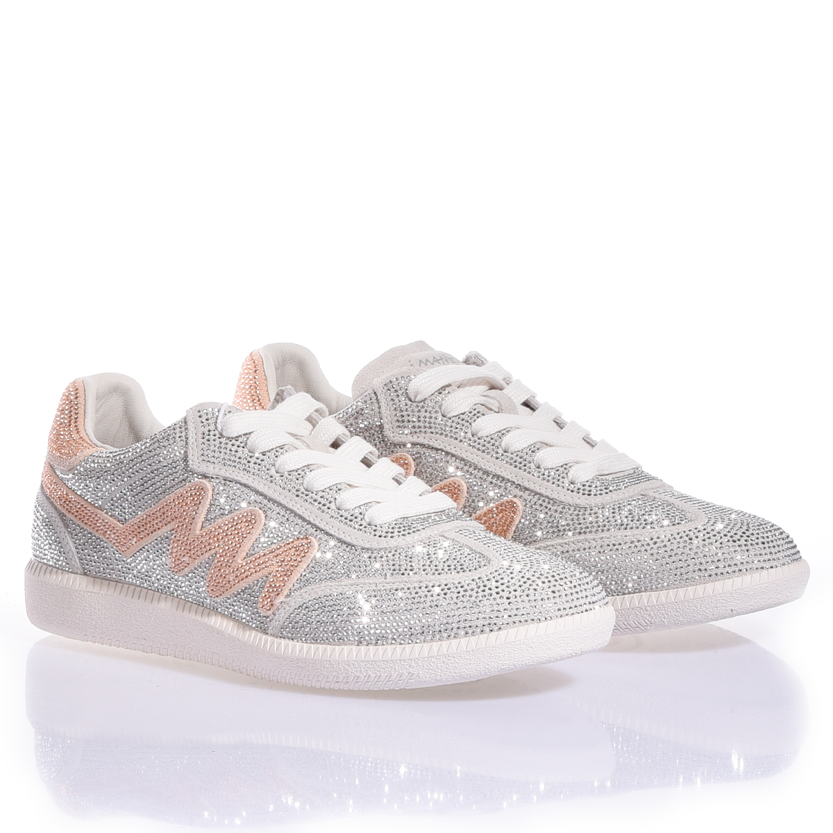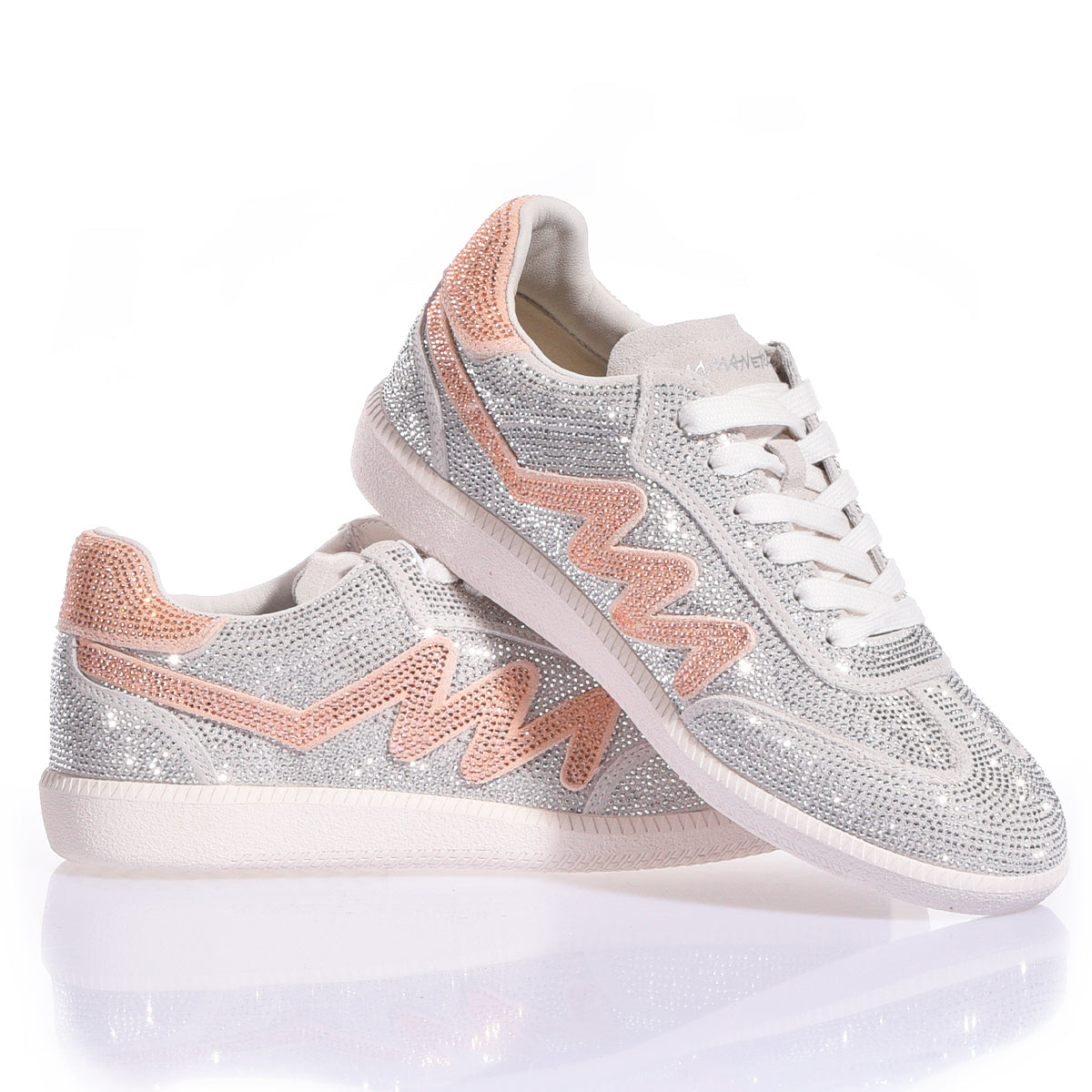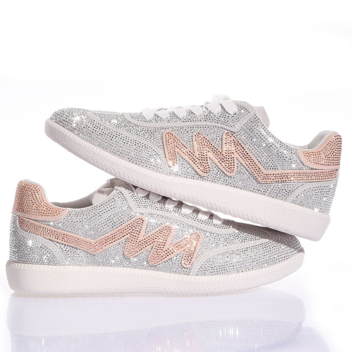 Deszcz najczystszego światła spowija model Dubai Imperial Rose. Te sneakery to hymn na cześć absolutnego blasku: cała cholewka jest w całości pokryta kryształkami Swarovskiego, co tworzy efekt „lodu”, który przechwytuje i zwielokrotnia każdy promień światła. Tę diamentową przestrzeń przełamuje delikatny i ekskluzywny akcent w postaci kultowej litery „M”, wykonanej z jasnoróżowych kryształków Swarovskiego. Ten subtelny, a zarazem drogocenny kontrast kolorystyczny nadaje butom romantyczną i wyrafinowaną duszę.