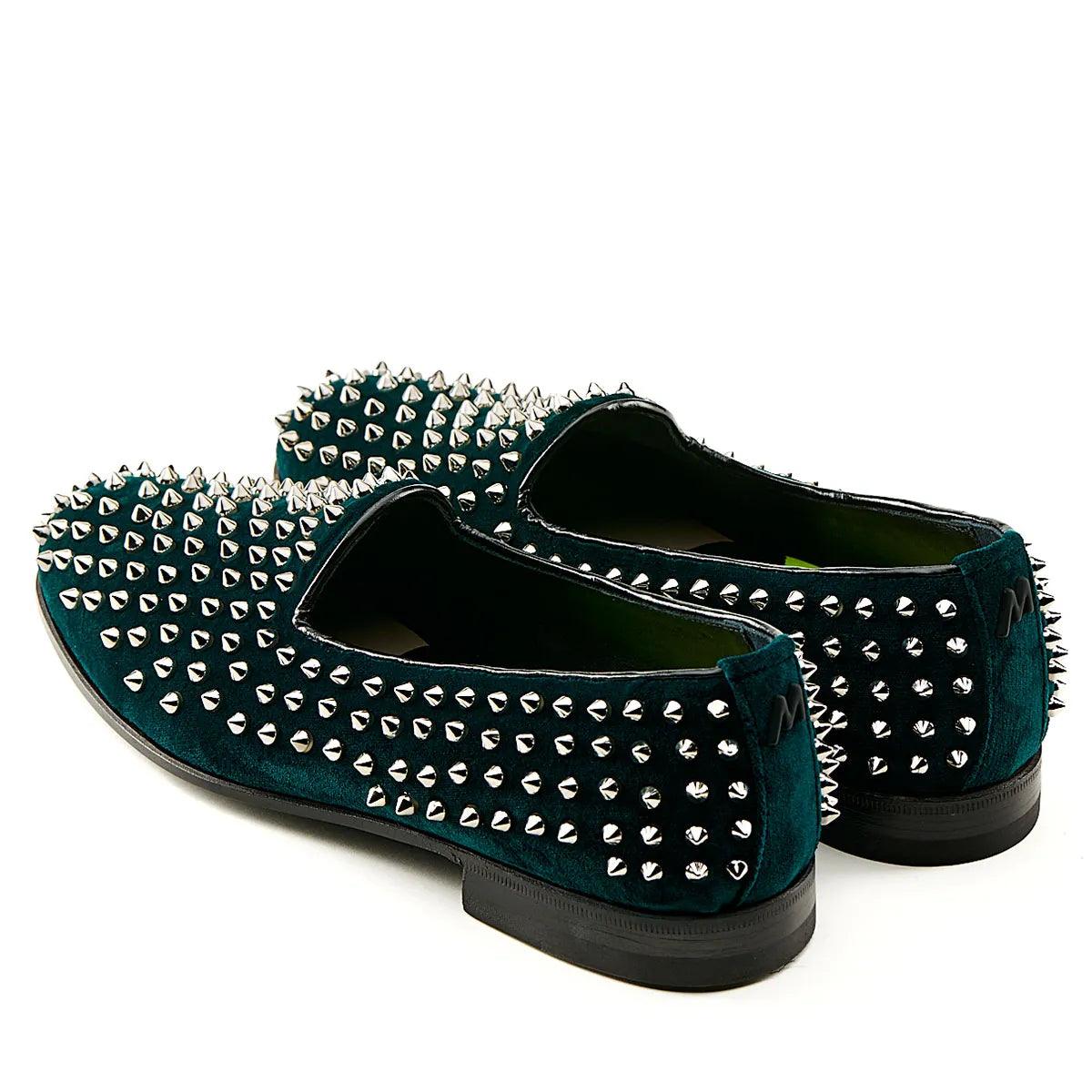 Mimanera Frontman Hedgehog Black to czarny aksamitny mokasyn, całkowicie pokryty ćwiekami, które nadają mu rockowy, odważny charakter. Charakterystyczne „M” Mimanera na pięcie dodaje projektowi ekskluzywnego akcentu. Idealny na specjalne okazje, to but dla tych, którzy szukają luksusu i elegancji w niepowtarzalnym wydaniu.