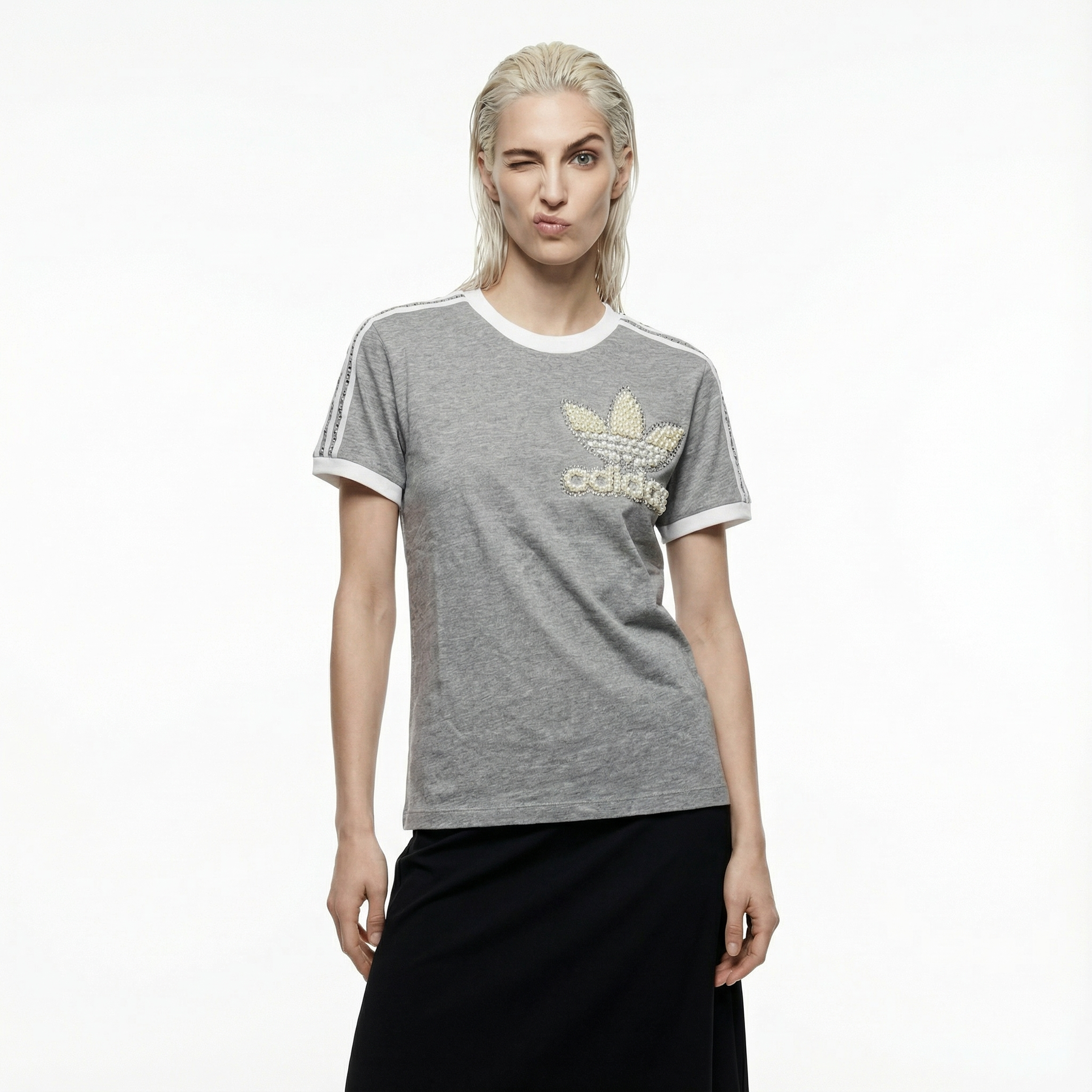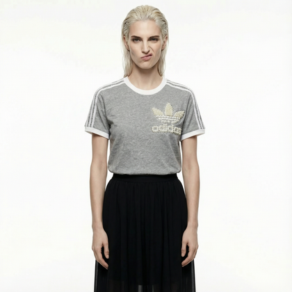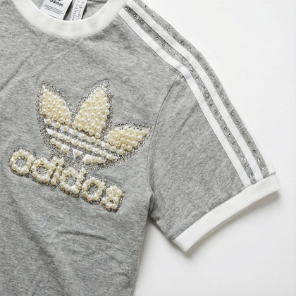 Szary T-shirt Adidas z detalami z pereł i kryształkami Swarovski – nieodparty miks sportowego stylu i luksusu. Damski krój regular podkreśla sylwetkę bez kompromisów w kwestii wygody. Idealna dla tych, którzy chcą błyszczeć stylem, zamieniając klasykę w manifest osobowości. Każdy egzemplarz jest personalizowany specjalnie dla Ciebie – bo prawdziwym sportem jest odwaga, by być inną.