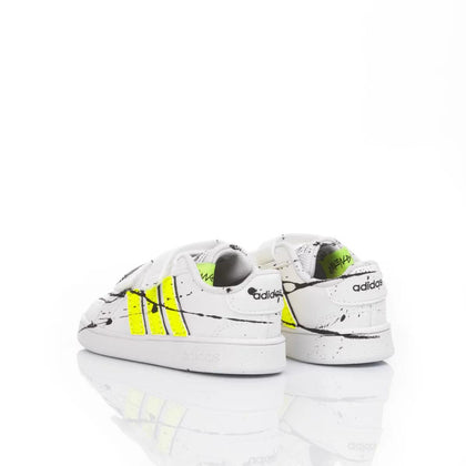 Adidas Baby Neon, a completely reinvented basic white sneaker: neon yellow fabric sewn onto the stripes, black paint splashes, and a vintage wash. These sneakers are suitable for men, women, and kids! We offer this model to allow you to create the perfect matchy-matchy style with your little ones.