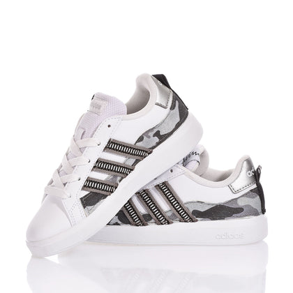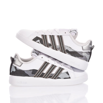Adidas Junior Grey Camo sono le sneakers custom da bambino super grintose.Il canvas camouflage avvolge la tomaia in una forma sinuosa, creando un effetto dinamico e deciso. Le righe Adidas in fantasia geometrica, aggiungono un contrasto moderno. Il passante sul retro in ecopelle nera e i lacci delavati, con effetto street, completano il design con un tocco grintoso e contemporaneo.