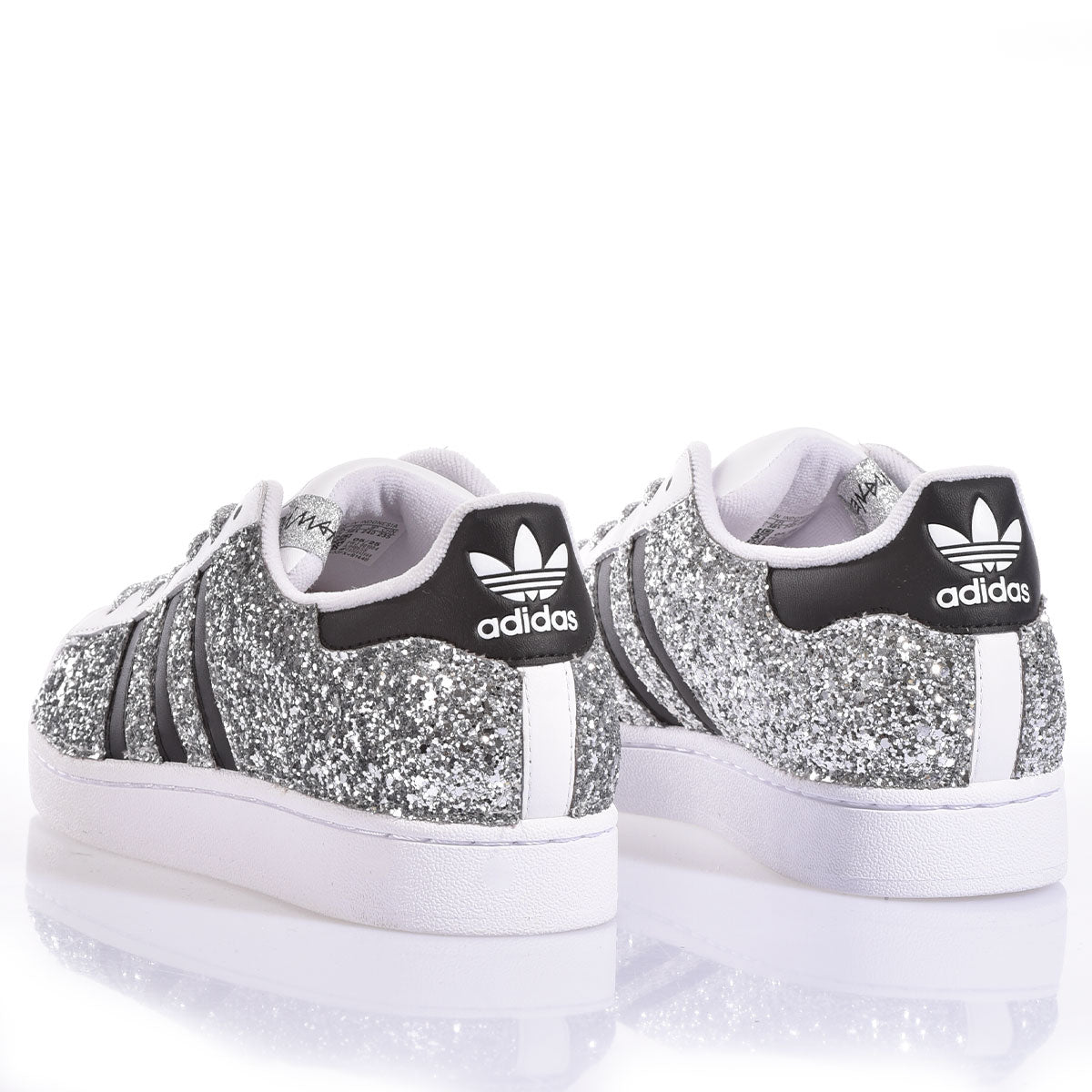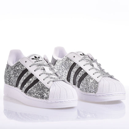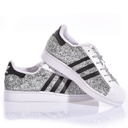 Adidas Superstar transformed into a sparkling masterpiece. Silver glitter covers the entire shoe, creating a bright and captivating shimmer effect. Matching silver laces complete the look. Perfect for those who want to shine in style while maintaining the iconic comfort and quality of the Superstar model.