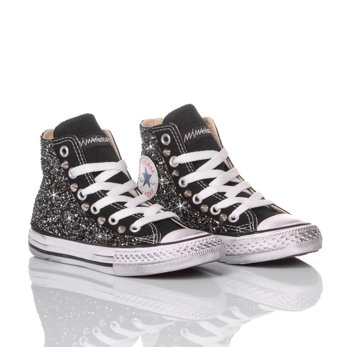 Converse All Star Junior Glitter Black, a little girl's trainer with an all-new, distinctive look. Covered in gold glitter on both sides and finished with studs between the eyelets, so that her feet sparkle with every step. This model is also available for women for a perfect mother-daughter matchy-matchy style. The Converse All Star Junior Glitter Black comes with its original white laces.