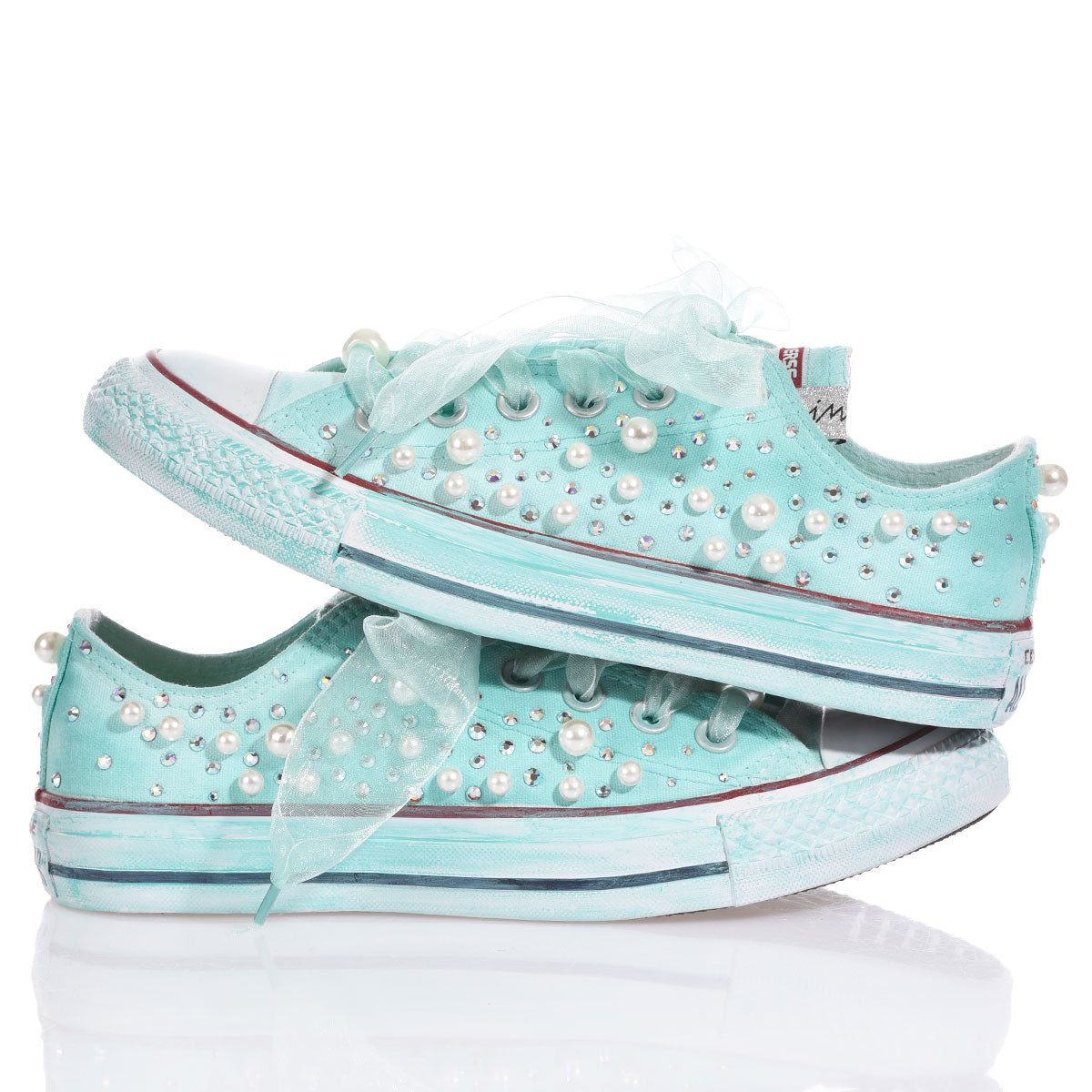 Converse Pearls Tiffany Ox is the perfect sneaker to elevate any look with a blend of edge and romance. A cascade of pearls and Swarovski crystals combined with distressed details creates a bold contrast, while organza laces tie into a delicate, feminine bow.