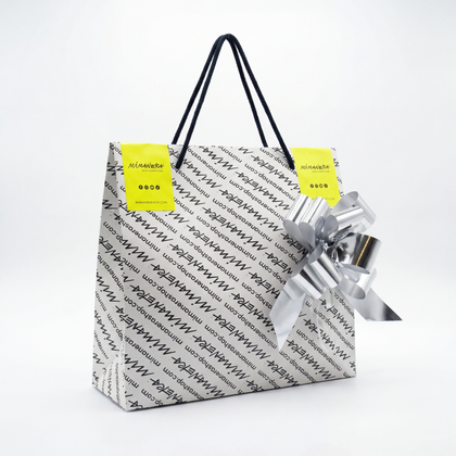 Turn your gift into an unforgettable experience. This personalized Mimanera Shop gift pack includes a glossy white bag with an exclusive logo, a neon yellow sticker to keep the mystery alive, and an elegant silver bow. Every detail is designed to surprise the recipient.