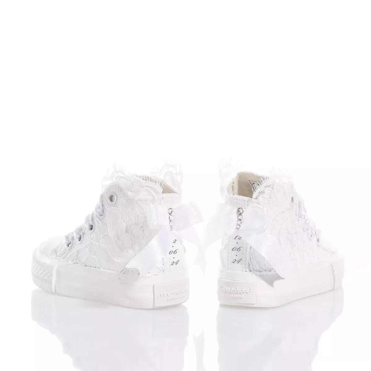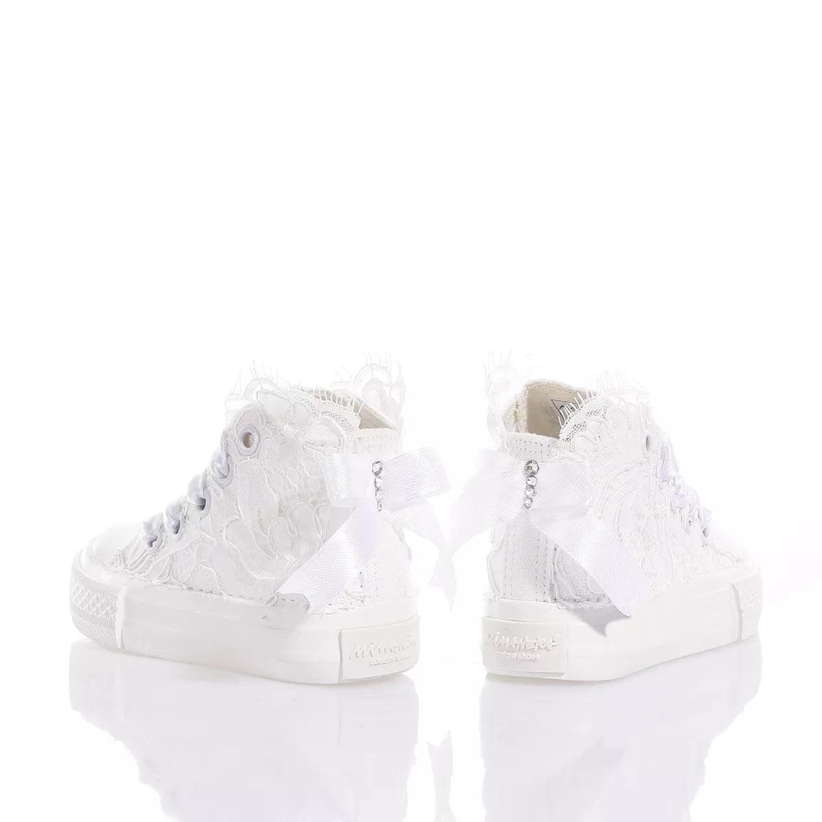 Mimanera Airlines Baby Amabel is covered in exquisite embroidered lace with a satin bow at the back, all embellished with a row of Swarovski crystals on the heel and white satin laces.