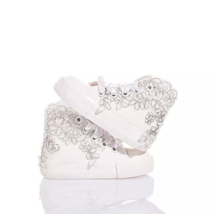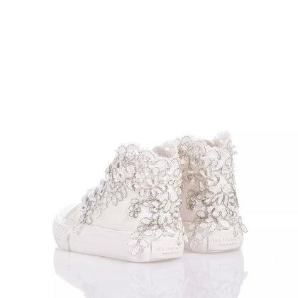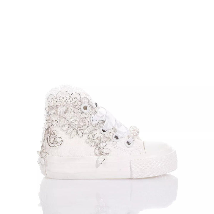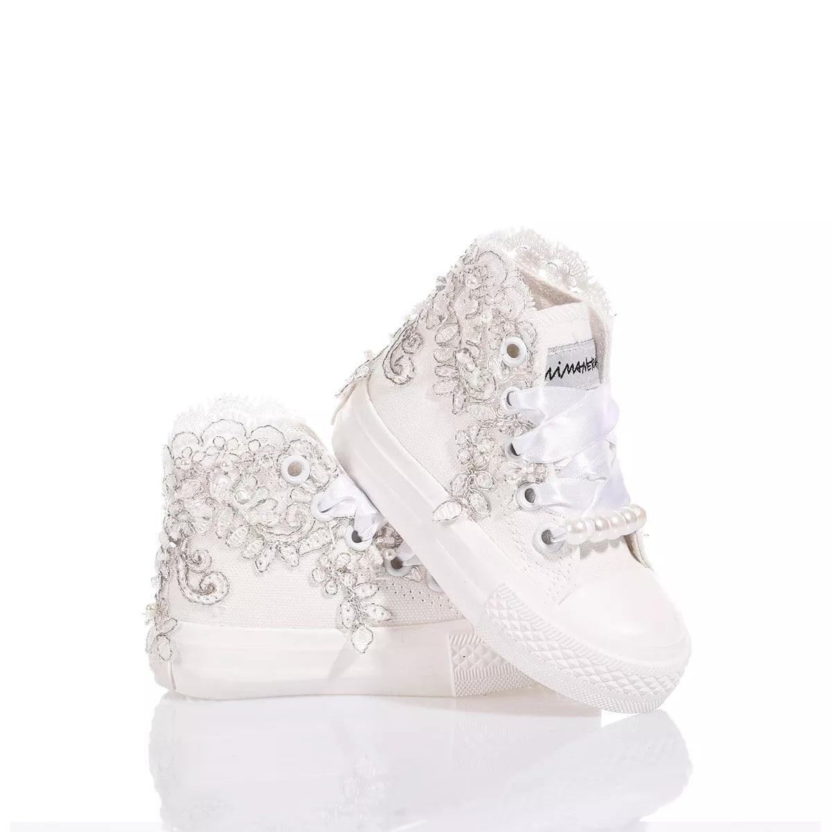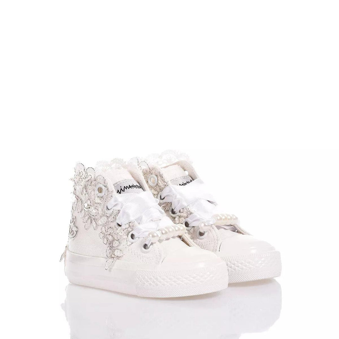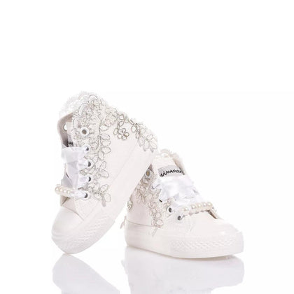 Mimanera Airlines Baby Lucy is the delicate and elegant sneaker for the little ones! Inspired by the iconic Converse model with a completely white sole and exclusive design: white and silver scalloped embroidery with sequins, pearls, and beads along the ankle, gently covering the sides of the sneakers. The look is completed with white satin laces featuring removable pearls at the bottom of the lacing.