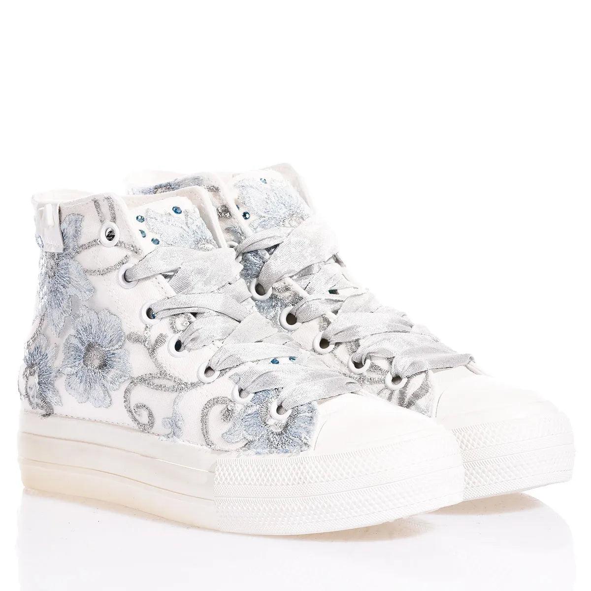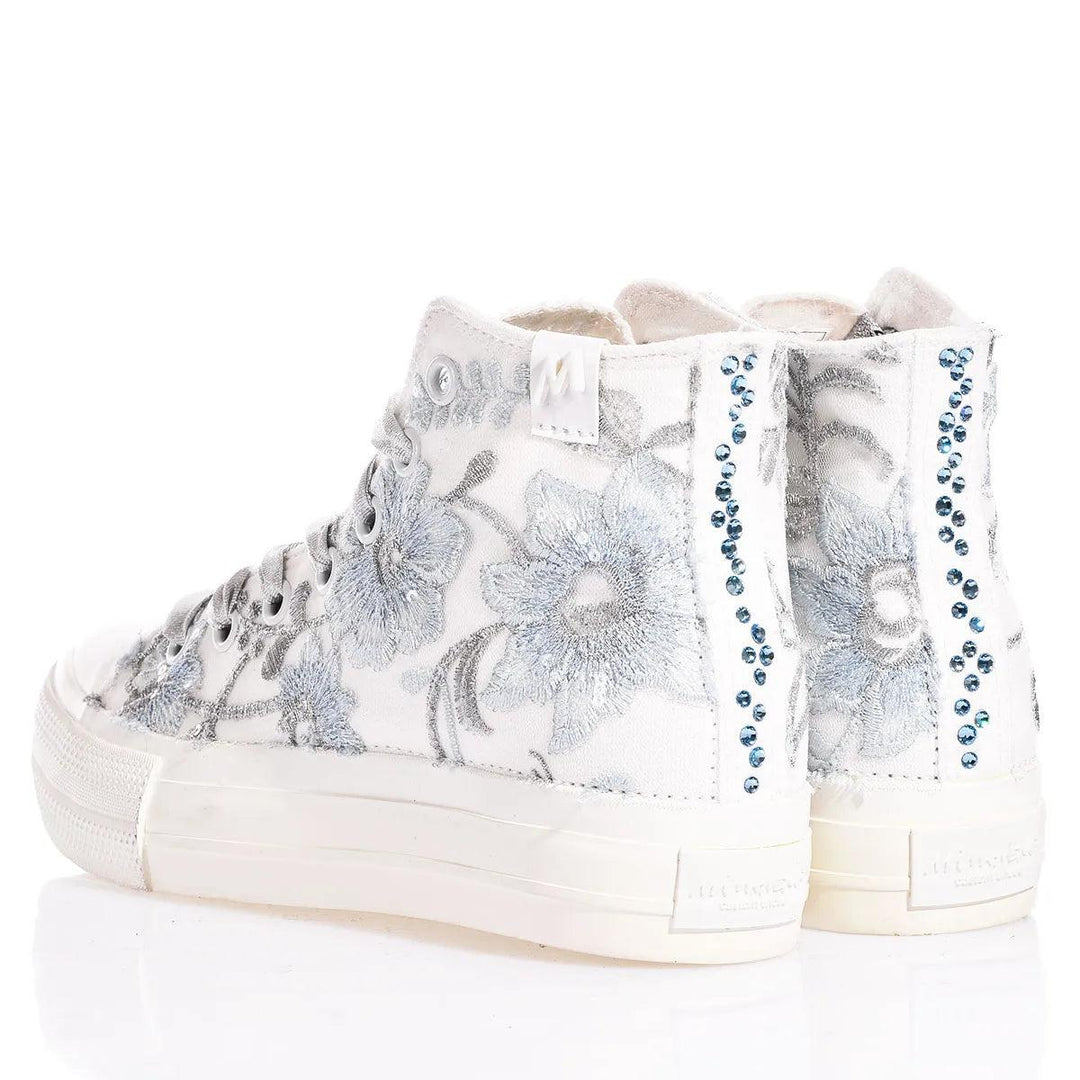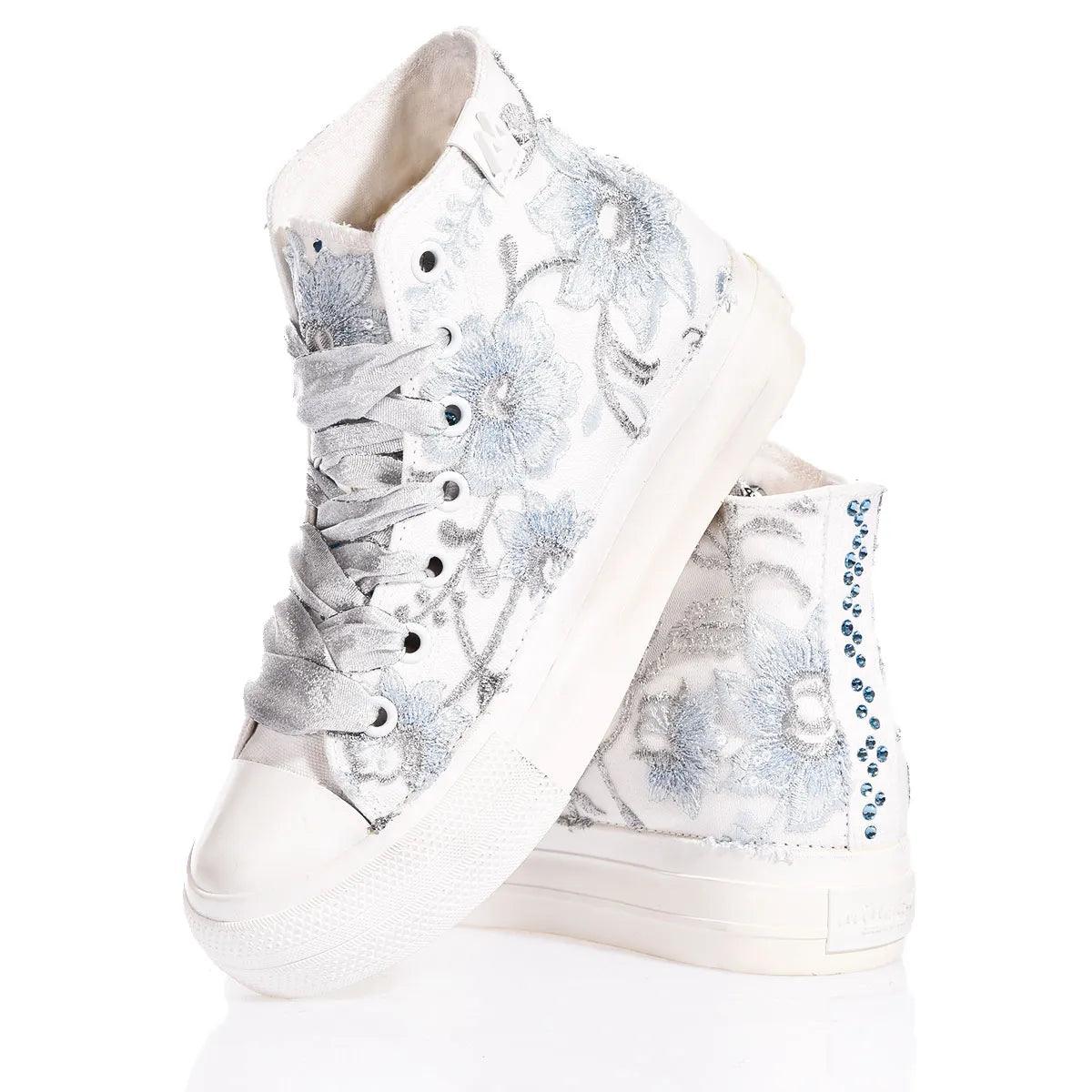 The white eyelets and silver laces delicately contrast with the trail of Swarovski crystals on the back, giving an additional touch of elegance and making these sneakers perfect for those who wish to relive the atmosphere of the French court with a modern twist.