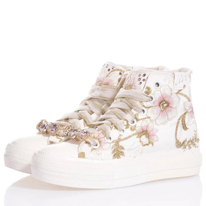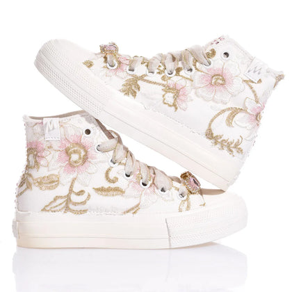 Gli occhielli bianchi e i lacci in organza beige, champagne e oro sono resi ancora più preziosi dall’accessorio con pietre incastonate sul fondo dell’allacciatura abbinati perfettamente alla scia di swarovski sul retro, conferendo un ulteriore tocco di eleganza e rendendo queste sneakers perfette per chi desidera rivivere l'atmosfera della corte francese con un twist moderno.