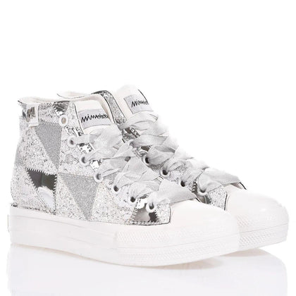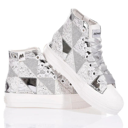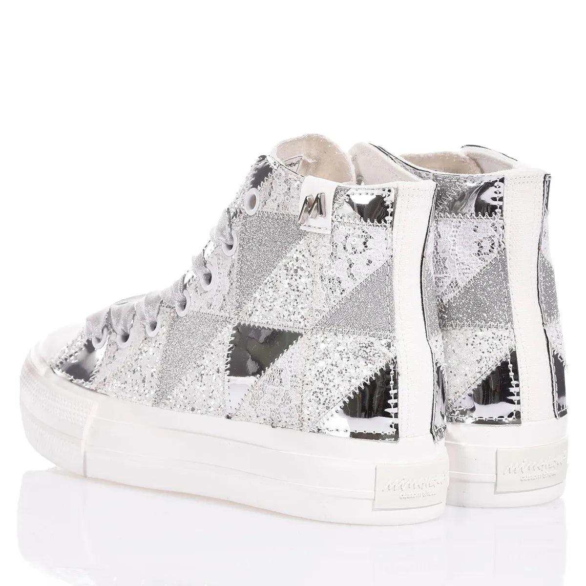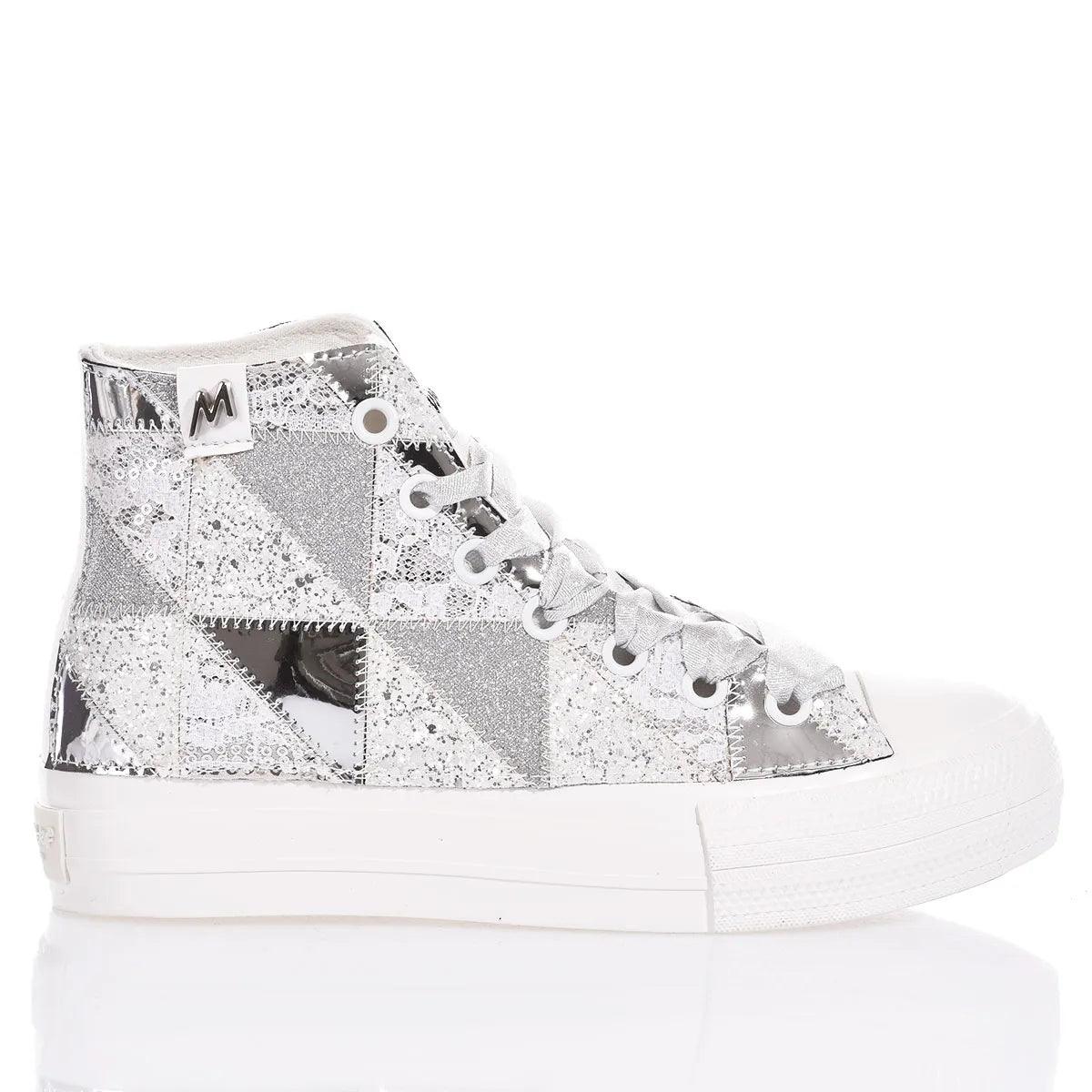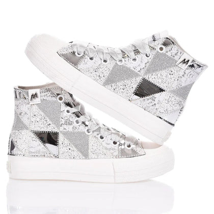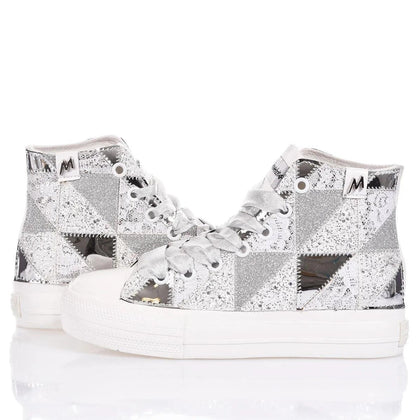 Mimanera Airlines Platform Silver Patch is the versatile and elegant sneaker of this season. Inspired by the classic Converse model, these sneakers with an all-white platform sole are designed to elongate the figure while ensuring exceptional comfort. Entirely covered in a finely crafted patchwork with various premium materials, all in silver tones for a glamorous and sophisticated look.
