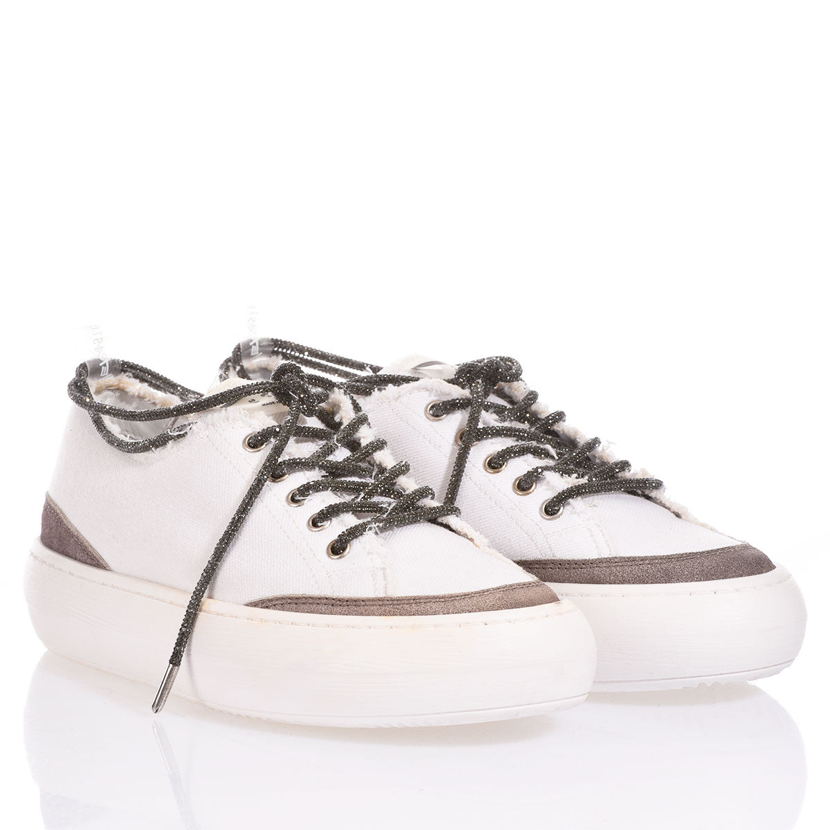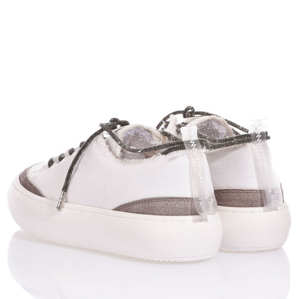 Mimanera Stone Lux Pepper: a comfortable and versatile sneaker in white canvas with suede details. Its look is completed by the interplay of Swarovski lace weaves.