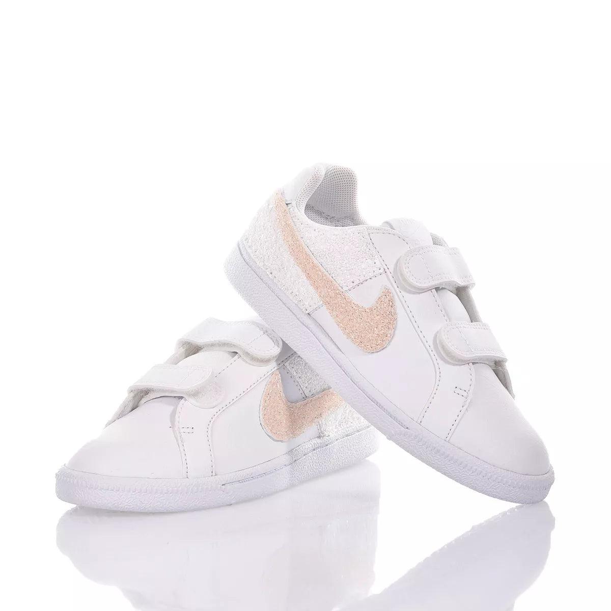 Nike Junior Amelie, the pastel-toned sneakers for girls. The back is covered with classic white glitter, while a particular delicate pastel-colored glitter is sewn onto the "swoosh" to make it stand out with a touch of elegance suitable for any occasion. Nike Junior Amelie features a cream satin lace in addition to its original white.